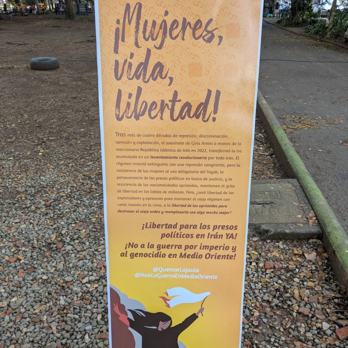 On September 21, 2025, Quemar La Jaula posted from Cali, Colombia about a commemoration of the third anniversary of the Gina Uprising with displays and discussions in a public park. Read on for English and Spanish descriptions and photos.