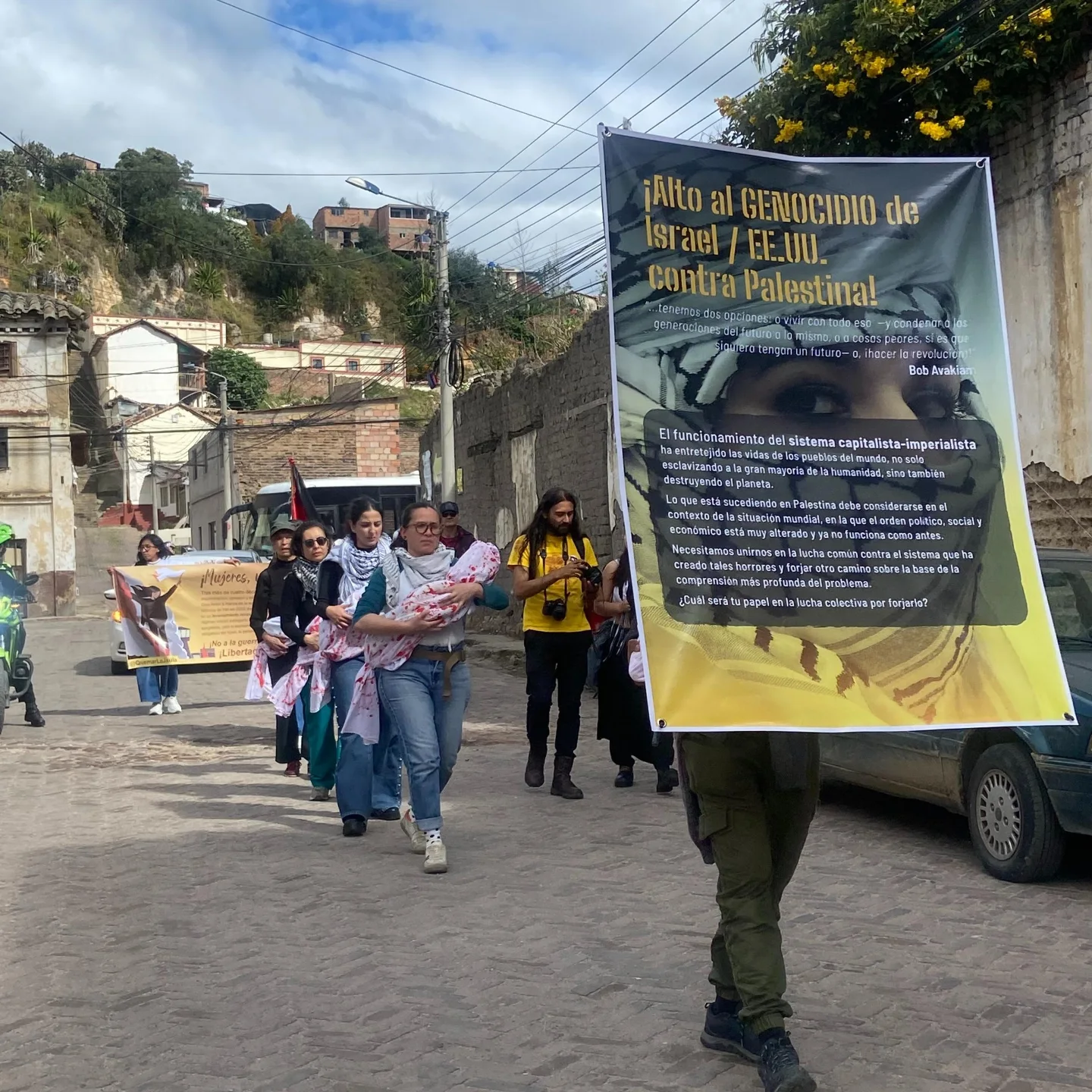 Quemar La Jaula, together with No a la Guerra en el Mediooriente, joined the procession at the Carnaval de Sogamoso with an artistic action condemning the genocide in Palestine. Read English and Spanish descriptions of the event, more photos and a video from the joint post on September 21.
