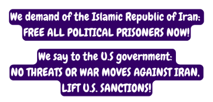 From diverse political perspectives, we treasure our unity in our common cause for justice: We demand of the Islamic Republic of Iran: FREE ALL POLITICAL PRISONERS NOW! We say to the US government: NO THREATS OR WAR MOVES AGAINST IRAN! LIFT SANCTIONS!
